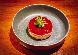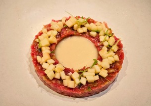 Relleno de esparrago tempura, calabaza marinada y láminas de buey negro Angus flambeado.