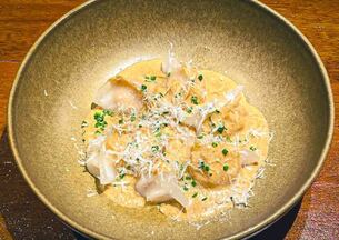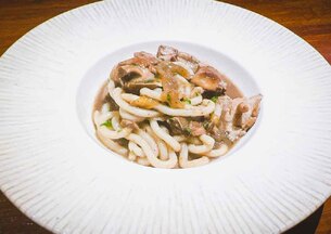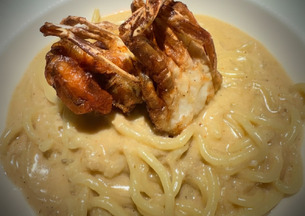 Fideos Udon servidos con una salsa cremosa de cangrejo azul, carne de Buey de Mar