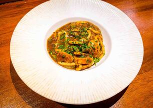 Relleno de pez mantequilla, calabaza marinada con foie gras caramelizado por encima.
