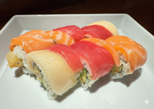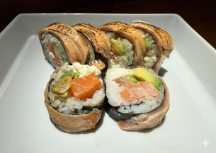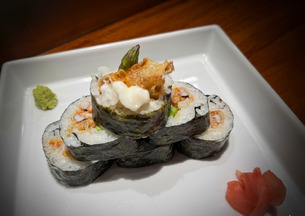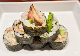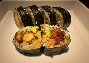 Relleno de dos langostinos en tempura, aguacate y cubierto de finas láminas de pescado fresco.