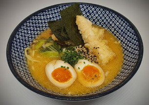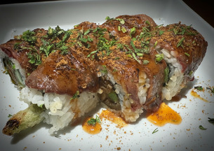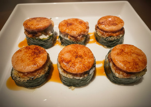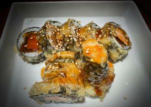 Relleno de salmón y calabaza marinada, hecho en tempura, servido tibio con salsa teriyaki.